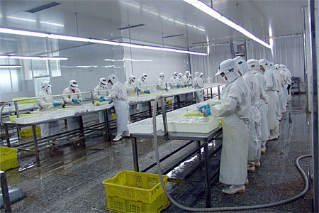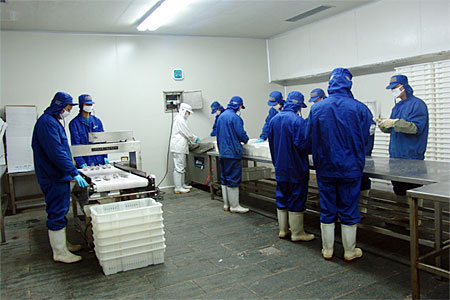 本公司是一家以水產(chǎn)品加工為主的出口型企業(yè),于2004年9月建成并正式投產(chǎn)。公司廠房完全按照歐洲聯(lián)盟的標準設(shè)計施工,目前占地14000平方米,建筑面積8000平方米,其中加工車間1600平方米。公司日速凍能力達100噸,儲藏庫容量為5000噸,主要加工蟹類、貝類、頭足類及魚蝦類水產(chǎn)品,產(chǎn)品銷往日本、東南亞及歐盟地區(qū)。